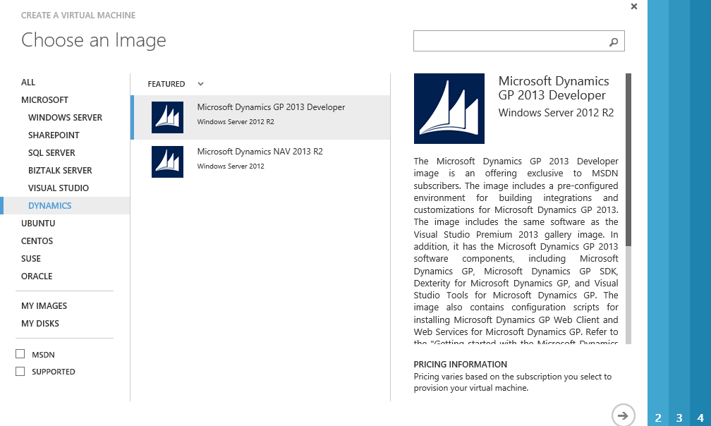 3. Localice el GP 2013 imagen desarrollador de Microsoft Dynamics de la galería dinámica en la sección de Microsoft. Tomar nota, también puede aprovisionar una imagen de Microsoft Dynamics NAV 2013 R2 también.