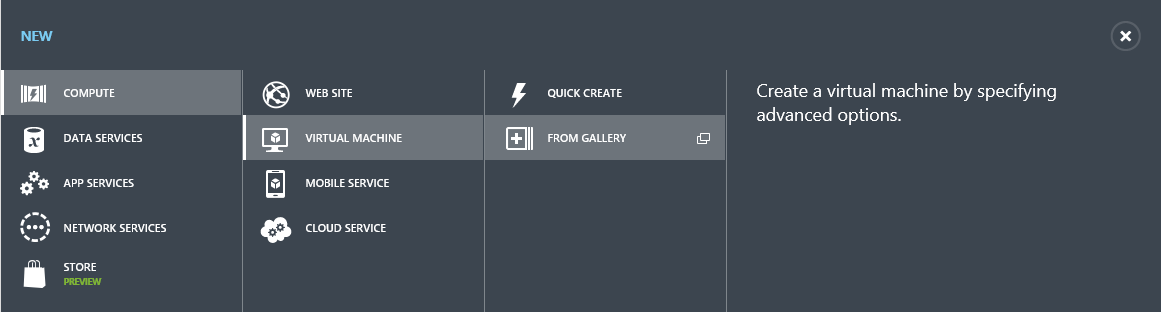 2 Haga clic en el botón + Nuevo en la parte inferior izquierda de la ventana, a continuación, seleccione Calcular | Máquina Virtual | Desde Galería para iniciar el proceso de aprovisionamiento.