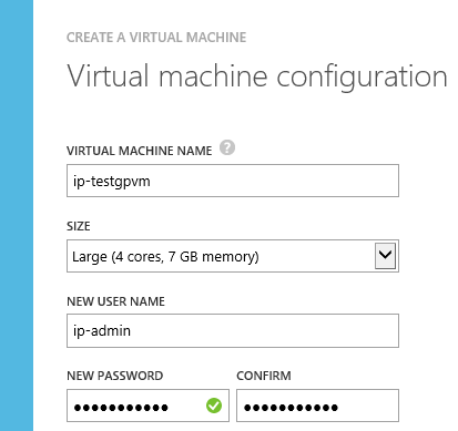 4 . Al hacer clic en el siguiente botón , a continuación, será llevado a la pantalla de Configuración de Máquina Virtual , donde se puede introducir el nombre y un usuario administrador local y la contraseña para Microsoft Dynamics GP 2013 VM . También se le pide al tamaño de la máquina virtual , por lo que no hay instrucciones claras . Dada la cantidad de software que se ejecuta en la máquina virtual (GP , SQL Server, Visual Studio, etc ) , me imagino un gran tamaño ( 4 núcleos , 7 GB de memoria) debe ser lo suficientemente bueno para empezar.