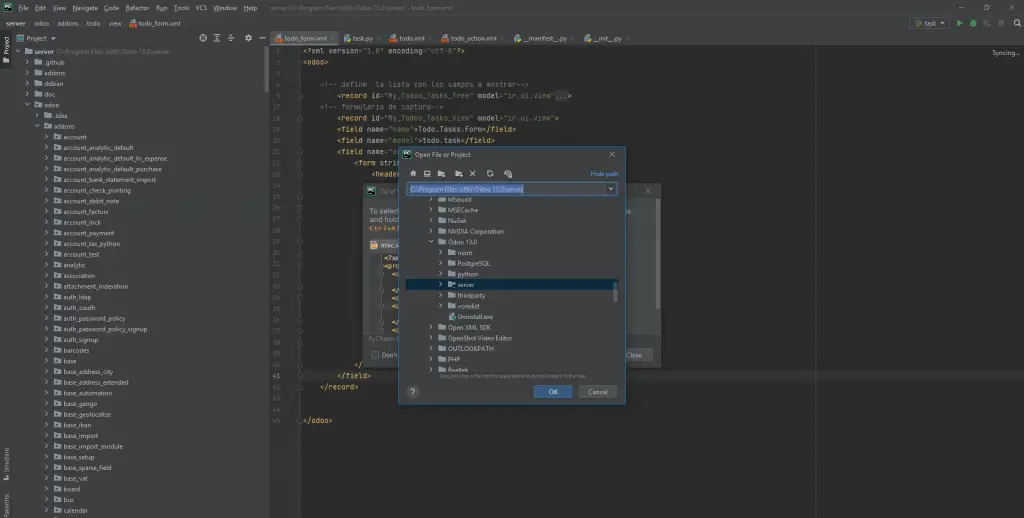 open o abrir seleccionar la carpeta carpeta server dentro de la instalación de ODOO Y LISTO